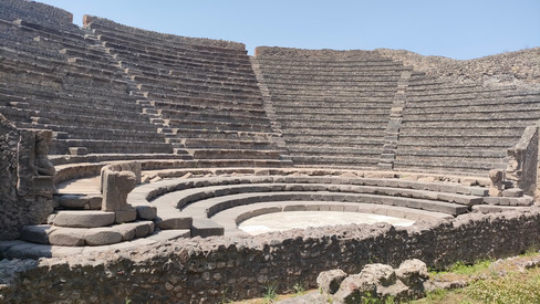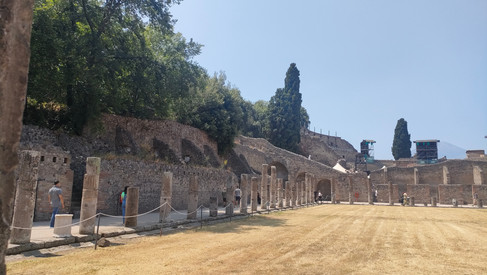 Nous verrons le forum, la grande avenue, le petit théâtre, les thermes, les passage piétons surélevés, le lupanar, quelques commerces, des habitations... et en final le musée avec des moulages en plâtre des personnes surprises par l'éruption.
