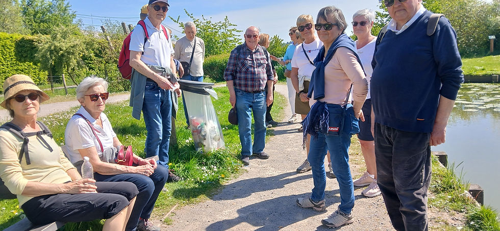 Les 16 participants du groupe des 6 km, après la traversée des parcs de l'Yser et des Caudreleux se sont dirigés vers l'étang de pêche où vont bientôt fleurir les nénuphars et y ont profité d'une halte bien méritée sous le soleil.